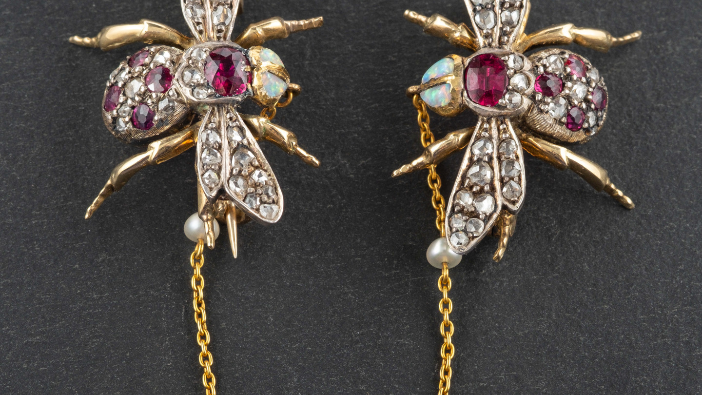 In the same naturalistic style, though probably a little later in date, we also have this beautiful pair of bee brooches, Lot 3336, estimated at £300-400. The attention to detail on them is incredible up to and including engraving single hairs to the thorax. Bees were a popular motif in the Victorian era, as they represented industriousness, loyalty and devotion. Also included in the sale is this very pretty swallow brooch, which carries an estimate of £200-300. Swallows symbolised faithfulness and were often given to loved ones before long voyages by the traveller as a promise that they, like the swallow would return home.