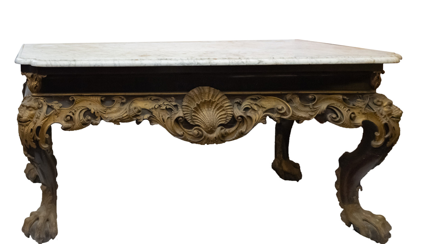 The furniture section is often the largest part of the auction, and this time will take the whole of the second day, with some 550 lots. One of the most eye-catching entries is lot 852, a mahogany, giltwood and marble topped side table in George II style, and in the manner of work by Matthias Lock, with carved lions’ heads at the corners. This magnificent piece which comes from a fine old Devon house is pitched at £3000-5000, but could well roar away.